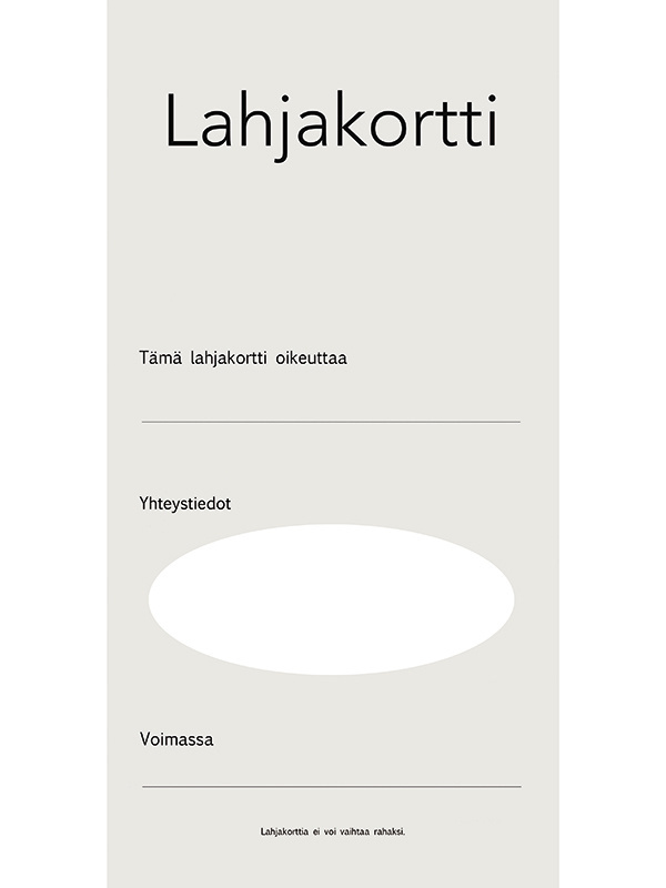 Miehillekin sopiva, laadukas hoito- ja tuotelahjakortti. Kaksipuolinen pystymalli, koko 10,5 x 21 cm.