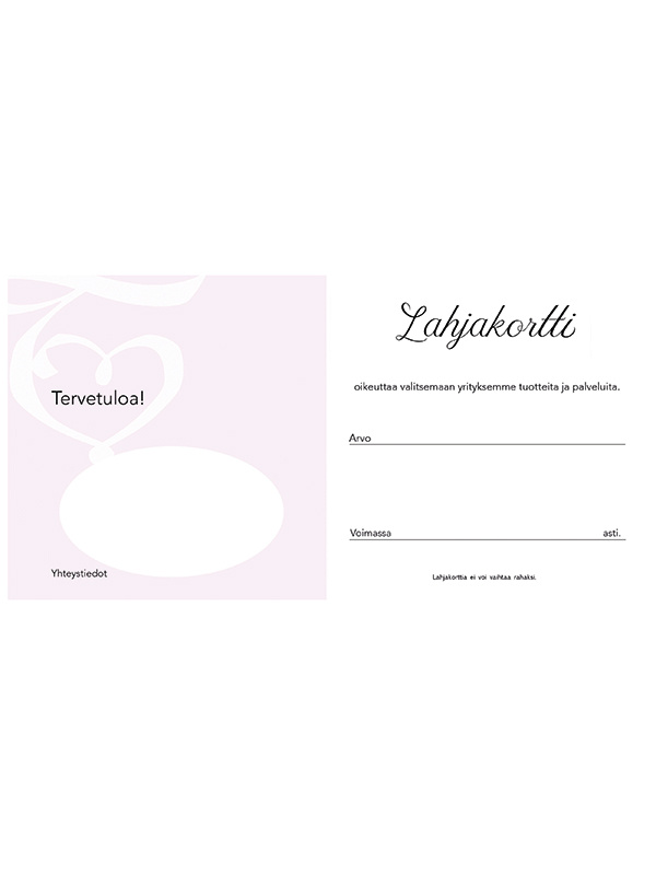 Laatukartongille painettu hoito- ja tuotelahjakortti. Taitettu malli, koko 10,5 x 10,5 cm.