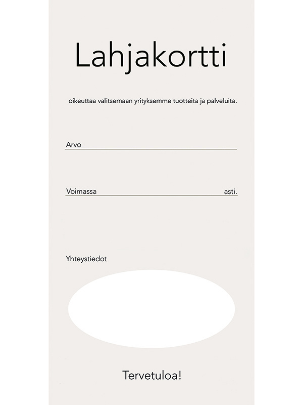 Erityisesti miehille sopiva laadukas lahjakortti. Kaksipuolinen pystymalli, koko 10,5 x 21 cm.