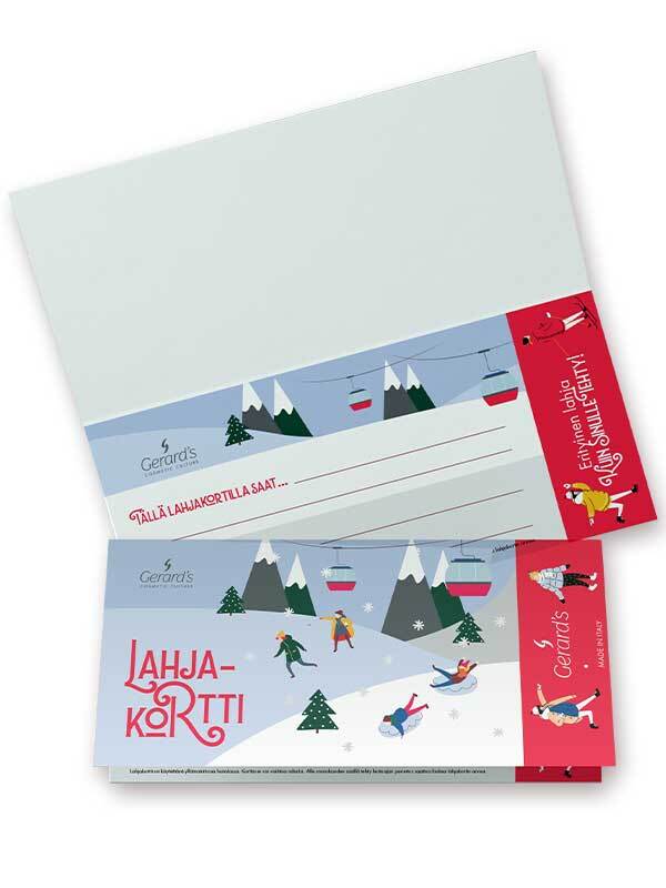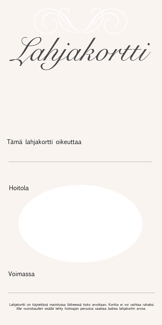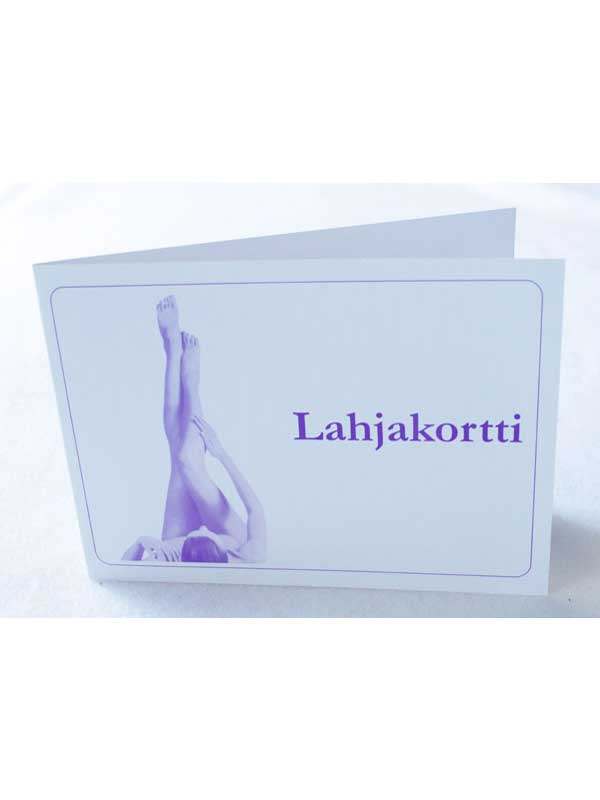 Heleä ja raikas hoito- ja tuotelahjakortti. Kaksipuolinen pystymalli, koko 10,5 x 21 cm.