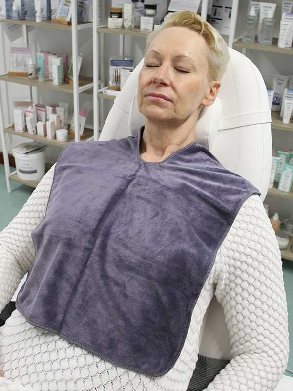 Tämä erityisesti hoitolakäyttöön suunniteltu U-muotoinen mikrokuituliina (40 x 50 cm) asettuu kaulan ympärille ja suojaa rintaa sekä olkapäitä. Asettamalla siivekkeet kasvojen ympärille hiusten suojaksi liina on täydellinen esimerkiksi kasvohoidoissa, joissa käytetään kuivuvia naamioita – liina estää naamion murujen putoamisen hiuksille tai vaatteille. Voidaan käyttää kuumana tai kylmänä kasvokompressina, alkupuhdistukseen tai naamioiden poistoon.