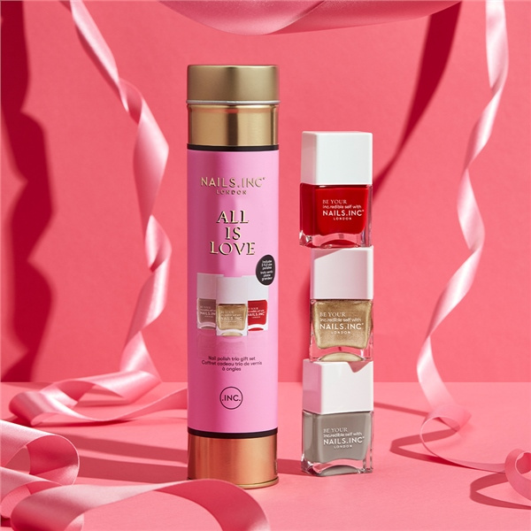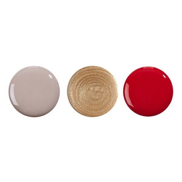 Lahjapakkauksessa kolme täysikokoista kynsilakkaa. Pakkaus sisältää punaisen, harmaan ja kullanvärisen lakan.
