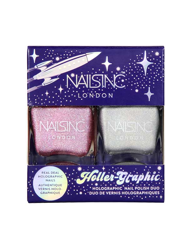 Duo pakkauksessa kaksi täysikokoista lakkaa. Upeat hologrammi-efekti-lakat hopean ja roosan sävyissä.