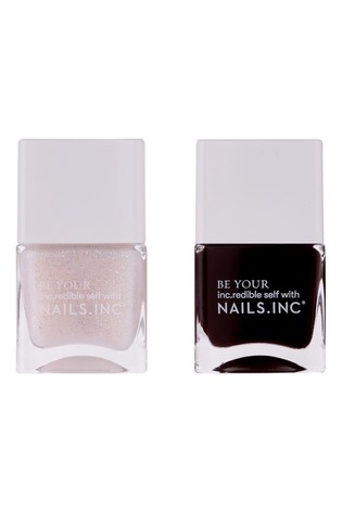 Kaksi kynsilakkasävyä kauniissa pakkauksessa. Sävyinä kimaltava nude sekä tumma luumunpunainen. Hauska, ripustettava pakkaus!