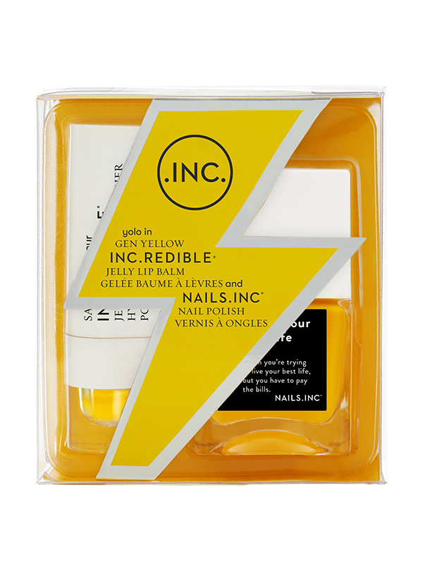 Trendikäs pakkaus piristävän keltaisia tuotteita. Pakkauksessa NailPure – kynsilakka sävyssä Living Your Best Life (14ml) sekä Jelly Lip Balm (3,8g) sävyssä Fuelled By Luck. Huulivoide reagoi huulten pH:n kanssa ja muuttuu yksilölliseksi, luonnolliseksi sävyksi jokaisella kantajallaan.