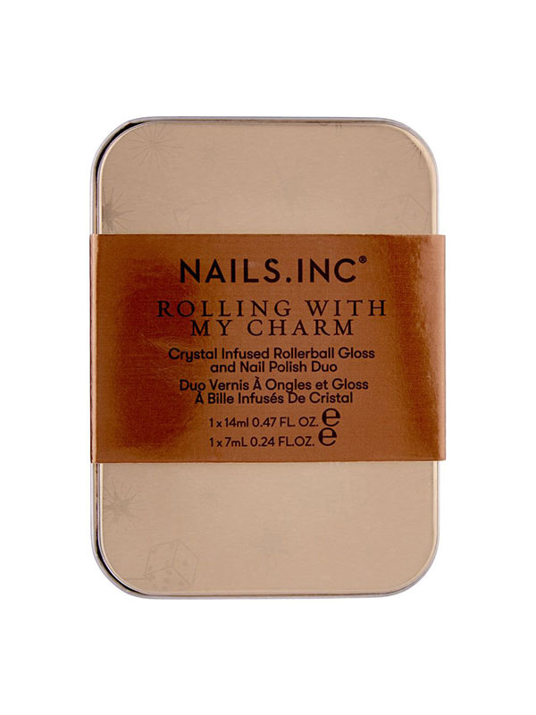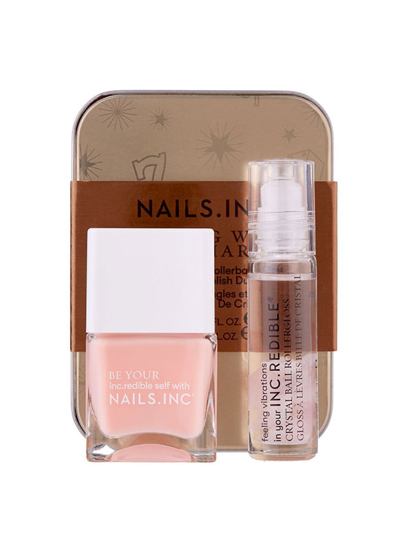 Pakkauksessa vaaleanroosa kynsilakka sekä kosteuttava Rollerball -huulikiille.