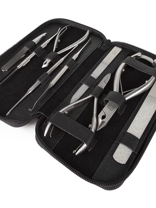 Tyylikäs vetoketjullinen nahkakotelo, jossa kaikki tärkeimmät välineet: