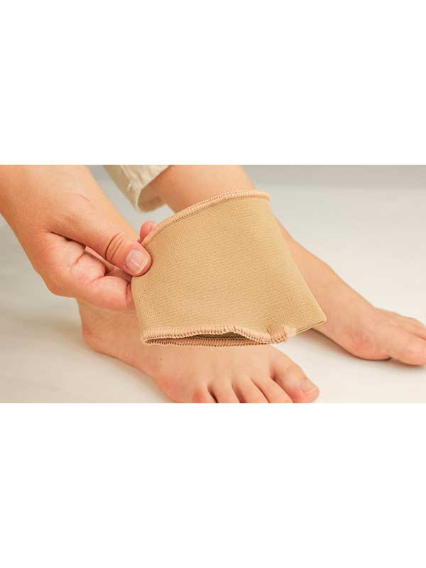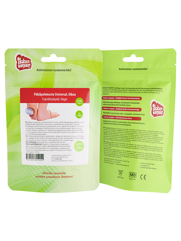 Jalkaan puettava, joustokankainen suoja, pehmeällä geelityynyllä keventää päkiänaluetta ehkäisten hiertymien ja kovettumien syntymistä. Lievittää tehokkaasti polttavaa kipua päkiäalueella esim. päkiän hermokivun (mortonin neurooma), rasvapatjan ohenemisen tai muun päkiänalueen aiheuttamalta vaivalta. Puetaan jalkaan niin että pehmeä geelityyny asettuu päkiänalueelle, 1. ja 2. varpaan välissä oleva ommel pitää pehmusteen hyvin paikallaan. Sopii noin 36-39 kokoiselle jalalle. Tilaa tarvittaessa vasemman jalan suoja erikseen!