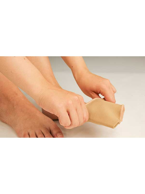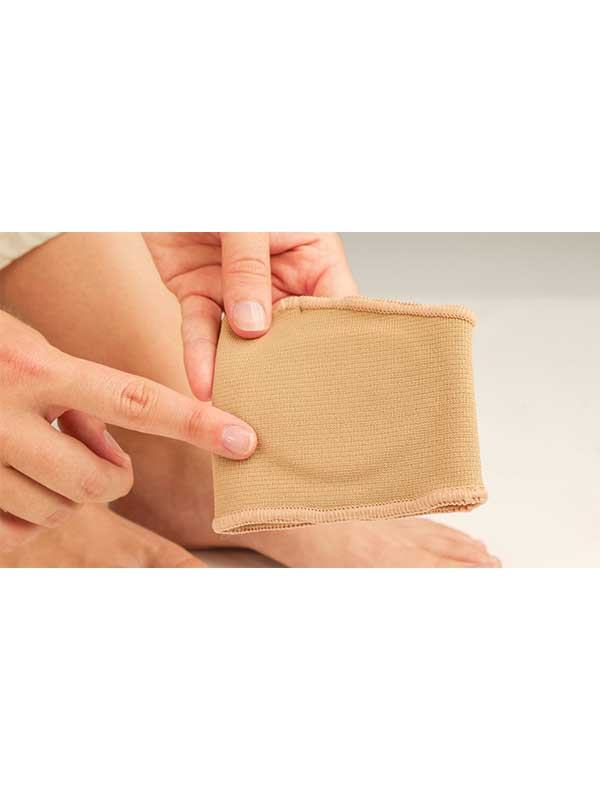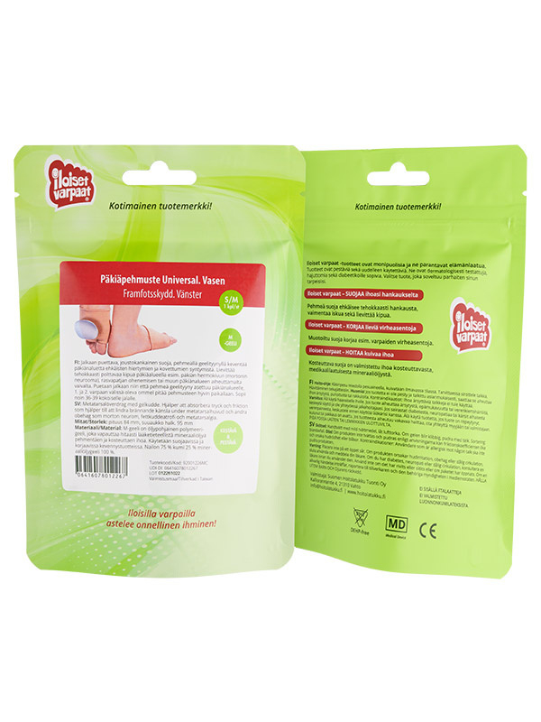 Jalkaan puettava, joustokankainen suoja, pehmeällä geelityynyllä keventää päkiänaluetta ehkäisten hiertymien ja kovettumien syntymistä. Lievittää tehokkaasti polttavaa kipua päkiäalueella esim. päkiän hermokivun (mortonin neurooma), rasvapatjan ohenemisen tai muun päkiänalueen aiheuttamalta vaivalta. Puetaan jalkaan niin että pehmeä geelityyny asettuu päkiänalueelle, 1. ja 2. varpaan välissä oleva ommel pitää pehmusteen hyvin paikallaan. Sopii noin 36-39 kokoiselle jalalle. Tilaa tarvittaessa oikean jalan suoja erikseen!