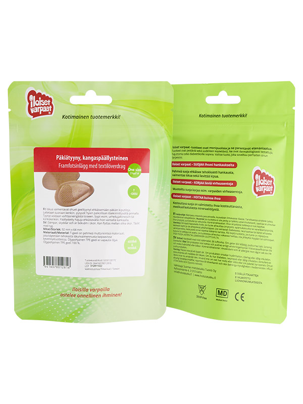 Iloiset varpaat-geelituotteet ovat käyneet läpi vuosia kestäneen prosessin. Raaka-aineet on tutkittu, biologiset analyysit tehty, riskit on kartoitettu ja suorituskyky testattu. Siksi ne poikkeavat tavanomaisista kevennystuotteista, joiden materiaalit saattavat aiheuttaa käyttäjälle enemmän haittaa kuin hyötyä. Tuotteissa käytetyt silikoni ja mineraaliöljyt ovat lääketieteellistä laatua. Ne ovat pestäviä ja uudelleenkäytettäviä, hajuttomia sekä diabeetikoille sopivia.