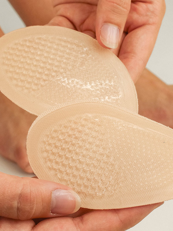 Iskua vaimentavat ohuet geelityynyt ehkäisemään päkiän kiputiloja. Laitetaan suoraan kenkiin, pysyvät hyvin paikoillaan itsekiinnittyvällä pinnalla. Tyynyt voidaan vaihtaa kengästä toiseen. Sopii esim. urheilujalkineisiin tai korkokenkiin. Päällystetty hajuja ehkäisevällä vaalean beigen värisellä kankaalla.