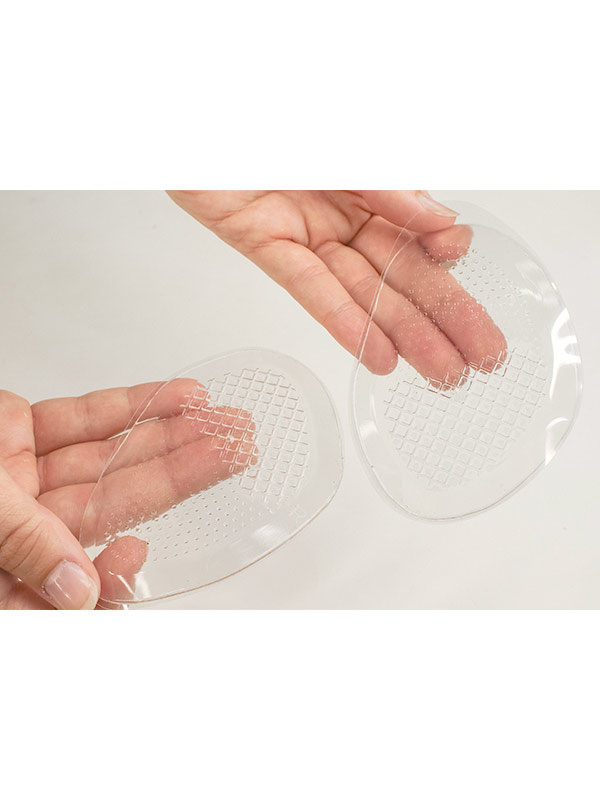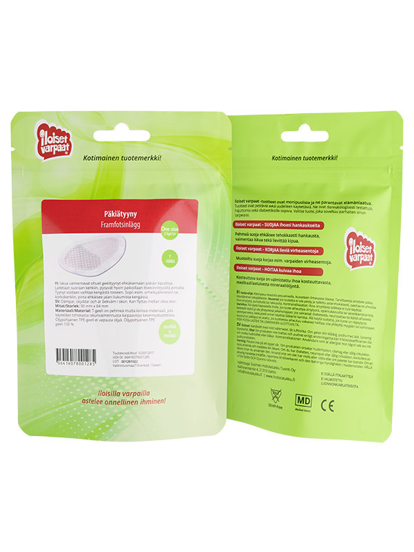 Iskua vaimentavat ohuet geelityynyt ehkäisemään päkiän kiputiloja. Laitetaan suoraan kenkiin, pysyvät hyvin paikoillaan itsekiinnittyvällä pinnalla. Tyynyt voidaan vaihtaa kengästä toiseen. Sopii esim. urheilujalkineisiin tai korkokenkiin, pinta ehkäisee jalan liukumista kengässä.