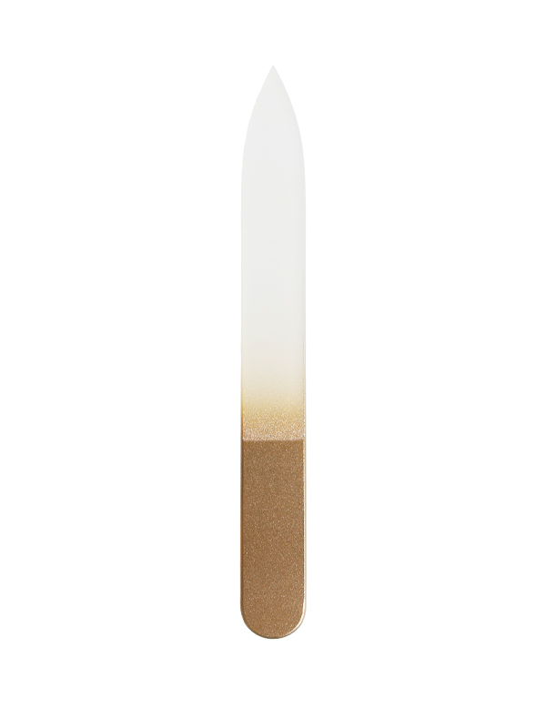 Kaunis, kultaisen värinen, kaksipuolinen viila on pakattu muovitaskuun. Lasiviilan voi steriloida kuumailmassa tai autoklaavissa max 150 astetta.