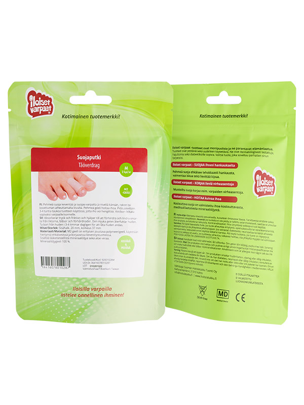 Pehmeä suoja keventää ja suojaa varpaita ja niveliä känsän, rakon tai kovettuman aiheuttamalta kivulta. Pehmeä geeli hoitaa ihoa. Pidä päivittäin 3-4 tuntia taukoa tuotteen käytössä, jotta iho voi hengittää. Voidaan leikata sopivaksi varpaalle/sormelle.
