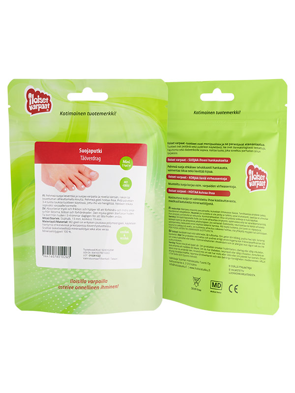 Pehmeä suoja keventää ja suojaa varpaita ja niveliä känsän, rakon tai kovettuman aiheuttamalta kivulta. Pehmeä geeli hoitaa ihoa. Pidä päivittäin 3-4 tuntia taukoa tuotteen käytössä, jotta iho voi hengittää. Voidaan leikata sopivaksi varpaalle/sormelle.