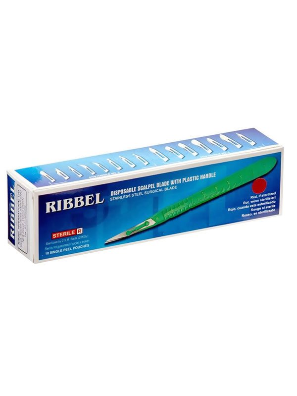 Ruostumattomasta teräksestä valmistettu kertakäyttöinen veitsenterä muovisella varrella. Yksittäin pakattu, steriili, terä suojattu erikseen muovikuorella.