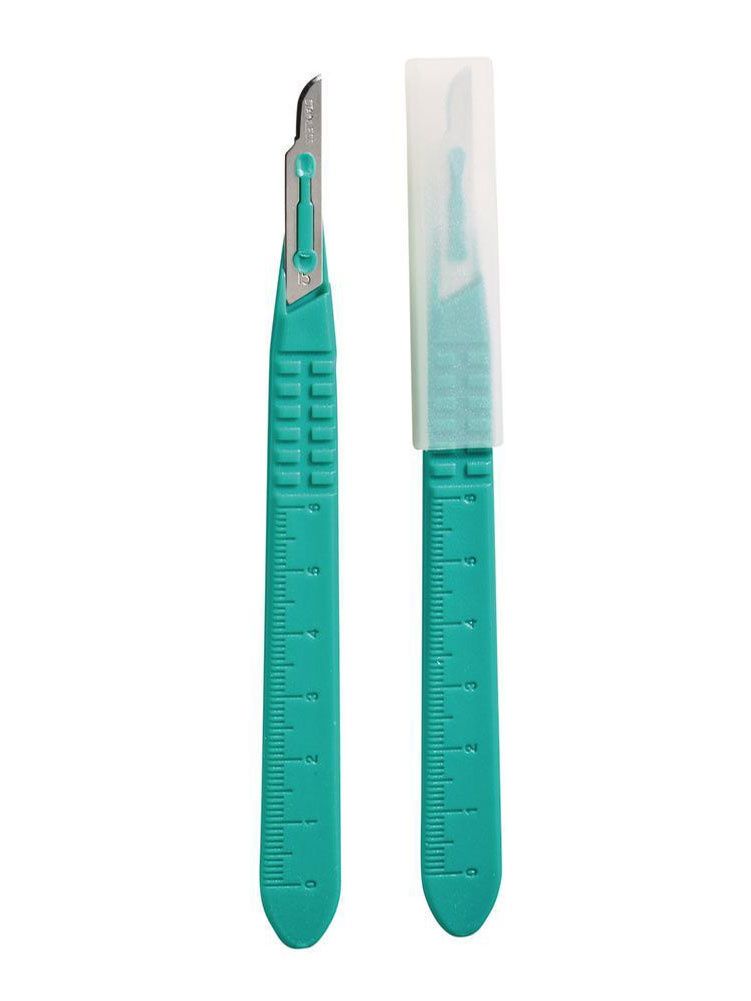 Ruostumattomasta teräksestä valmistettu kertakäyttöinen veitsenterä muovisella varrella. Yksittäin pakattu, steriili, terä suojattu erikseen muovikuorella.