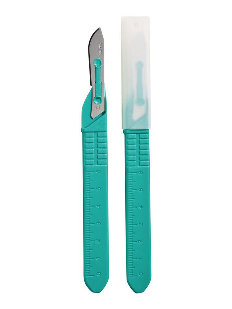 Ruostumattomasta teräksestä valmistettu kertakäyttöinen veitsenterä muovisella varrella. Yksittäin pakattu, steriili, terä suojattu erikseen muovikuorella.