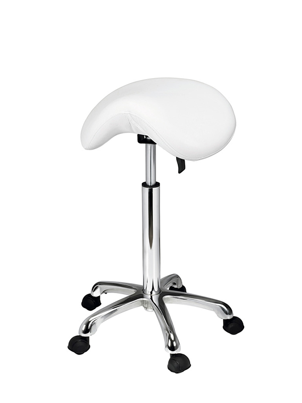 Joka hoitolaan sopiva satulatuoli, jossa hyvin liikkuva, kromattu jalkaosa. Verhoilu helposti puhtaanapidettävää keinonahkaa. Korkeus 55-73 cm.