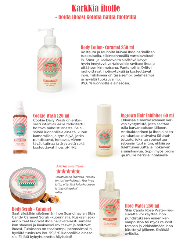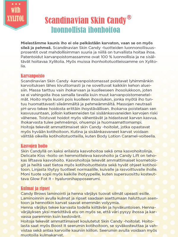 8-sivuinen esite kertoo karvanpoistosta ja esittelee kuluttajatuotteet. Taakse saat oman hoitolasi tiedot esimerkiksi leimasimella.