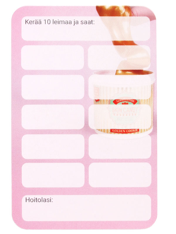 Skin Candy leimakortti. Luo oma kanta-asiakasjärjestelmä leimakorttien avulla esimerkiksi siten, että asiakas saa leiman joka kerta, kun hän ostaa vähintään tietyllä summalla Skin Candy -hoitoja. Kortin ollessa täynnä, voit antaa lahjan tai tarjoushoidon.
