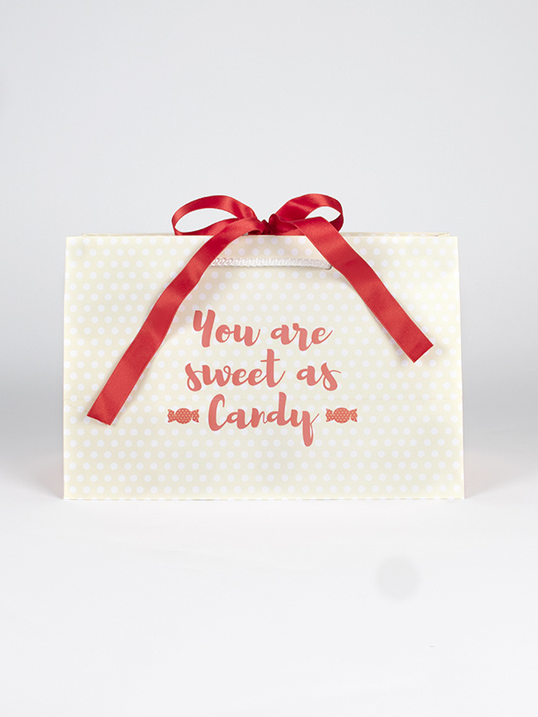 Suloinen Skin Candyn paperikassi punaisilla nauhoilla.