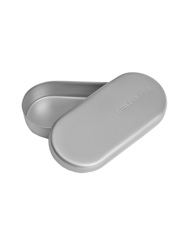 Pieni, teräksinen instrumenttilaatikko kannella, sopii esimerkiksi poranterille. Koko 90 x 40 x 15 mm. Ruostumatonta terästä, voidaan steriloida.