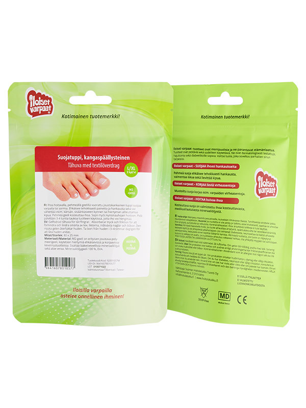 Ihoa hoitavalla, pehmeällä geelillä vuorattu joustokankainen tuppi suojaa varpaita tai sormia. Ehkäisee tehokkaasti painetta ja hankausta sekä voi vähentää esim. känsän, sisäänkasveen kynnen tai hiertymän aiheuttamaa kipua. Pehmeä geeli kosteuttaa ihoa. Sopii myös kynsinauhojen hoitoon. Pidä päivittäin 3-4 tuntia taukoa tuotteen käytössä, jotta iho voi hengittää.