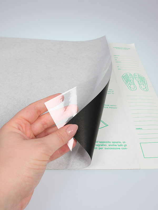 5. Nosta silikonisuoja ylös ja poista hiilipaperi tarra-alustalta varoen.