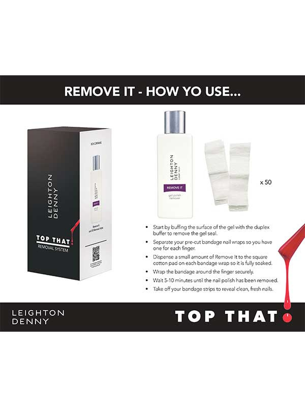Pakkauksessa geelilakkauksen poistoneste ja poistolappuja jälleenmyyntiin asiakkaalle kotikäyttöön.