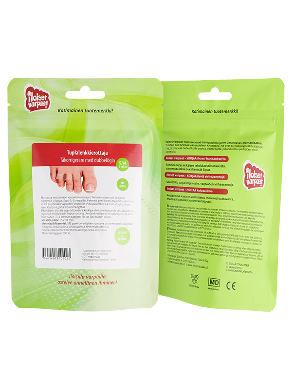 Auttaa erottamaan varpaita toisistaan. Pehmeä materiaali ehkäisee hiertymiä ja kipua. Sopii 3.-5.varpaille. Pehmeä geeli kosteuttaa ihoa. Joustavat lenkit pujotetaan vapaiden ympärille. Pidä päivittäin 3-4 tuntia taukoa tuotteen käytössä, jotta iho voi hengittää.