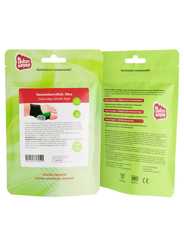 Iloiset varpaat-geelituotteet ovat käyneet läpi vuosia kestäneen prosessin. Raaka-aineet on tutkittu, biologiset analyysit tehty, riskit on kartoitettu ja suorituskyky testattu. Siksi ne poikkeavat tavanomaisista kevennystuotteista, joiden materiaalit saattavat aiheuttaa käyttäjälle enemmän haittaa kuin hyötyä. Tuotteissa käytetyt silikoni ja mineraaliöljyt ovat lääketieteellistä laatua. Ne ovat pestäviä ja uudelleenkäytettäviä, hajuttomia sekä diabeetikoille sopivia.