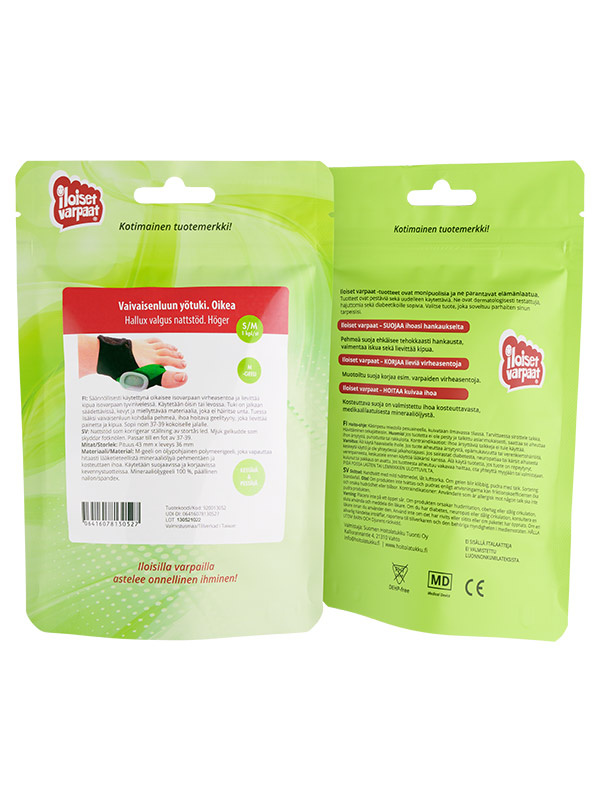 Iloiset varpaat -geelituotteet ovat monipuolisia ja ne parantavat elämänlaatua. Tuotteet ovat pestäviä sekä uudelleen käytettäviä. Ne ovat dermatologisesti testattuja, hajuttomia sekä diabeetikoille sopivia. Tuotteissa käytetyt silikonit ja mineraaliöljyt ovat lääketieteellistä laatua.