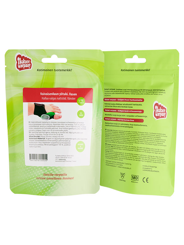 Iloiset varpaat-geelituotteet ovat käyneet läpi vuosia kestäneen prosessin. Raaka-aineet on tutkittu, biologiset analyysit tehty, riskit on kartoitettu ja suorituskyky testattu. Siksi ne poikkeavat tavanomaisista kevennystuotteista, joiden materiaalit saattavat aiheuttaa käyttäjälle enemmän haittaa kuin hyötyä. Tuotteissa käytetyt silikoni ja mineraaliöljyt ovat lääketieteellistä laatua. Ne ovat pestäviä ja uudelleenkäytettäviä, hajuttomia sekä diabeetikoille sopivia.
