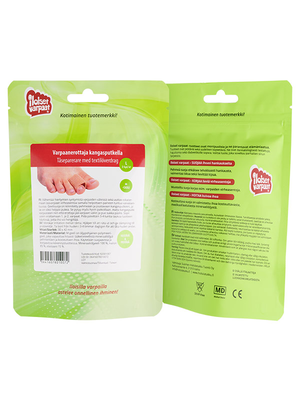 Vähentää hiertymien syntymistä varpaiden väleissä sekä auttaa oikaisemaan isovarpaan virheasentoa samalla helpottaen paineen tuntua vaivaisenluussa. Geelisuoja on kiinnitetty pehmeään ja joustavaan kangasputkeen, ja se on siksi helppo pukea. Se pysyy myös hyvin paikoillaan. Aseta kangasputki varpaaseen niin että erottaja jää varpaan väliin ja pue sukka päälle. Sopii usein erottamaan 1. ja 2. varpaat. Pidä päivittäin 3-4 tuntia taukoa tuotteen käytössä, jotta iho voi hengittää.