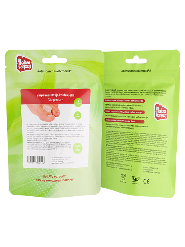 Oikaisee vinoa isovarvasta sekä erottaa ahtaita varpaanvälejä. Pehmeä materiaali hoitaa ja suojaa myös varpaiden ihoa hankaumilta ja känsiltä. Aseta erottaja varpaiden väliin ja pue sukka päälle. Sopii usein erottamaan 3./4. tai 4./5. varpaat. Pidä päivittäin 3-4 tuntia taukoa tuotteen käytössä, jotta iho voi hengittää.