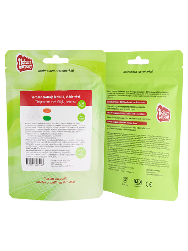 Iloiset varpaat-geelituotteet ovat käyneet läpi vuosia kestäneen prosessin. Raaka-aineet on tutkittu, biologiset analyysit tehty, riskit on kartoitettu ja suorituskyky testattu. Siksi ne poikkeavat tavanomaisista kevennystuotteista, joiden materiaalit saattavat aiheuttaa käyttäjälle enemmän haittaa kuin hyötyä. Tuotteissa käytetyt silikoni ja mineraaliöljyt ovat lääketieteellistä laatua. Ne ovat pestäviä ja uudelleenkäytettäviä, hajuttomia sekä diabeetikoille sopivia.