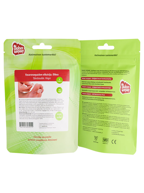 Auttaa korjaamaan koukistuneiden varpaiden virheasentoja. Ehkäisee myös hiertymien syntymistä koukistuneissa varpaanpäissä. Käytetään sukan alla ja sopii myös aktiiviliikkujille. Aseta geelityyny varpaiden alle paksumpi pää isovarvasta kohden, lenkki pujotetaan 2. tai 3.varpaaseen. Pidä päivittäin 3-4 tuntia taukoa tuotteen käytössä, jotta iho voi hengittää.