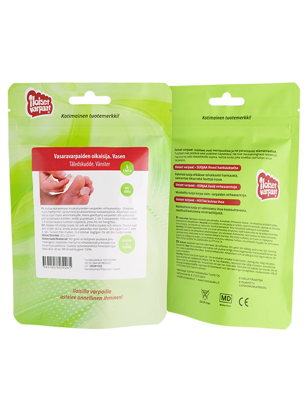 Iloiset varpaat -geelituotteet ovat monipuolisia ja ne parantavat elämänlaatua. Tuotteet ovat pestäviä sekä uudelleen käytettäviä. Ne ovat dermatologisesti testattuja, hajuttomia sekä diabeetikoille sopivia. Tuotteissa käytetyt silikonit ja mineraaliöljyt ovat lääketieteellistä laatua.