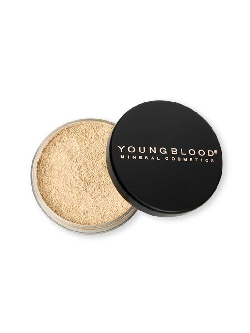 Kopauta puuteria hieman rasian kanteen ja levitä kasvoille pyörivin liikkein valitsemallasi Youngblood siveltimellä.