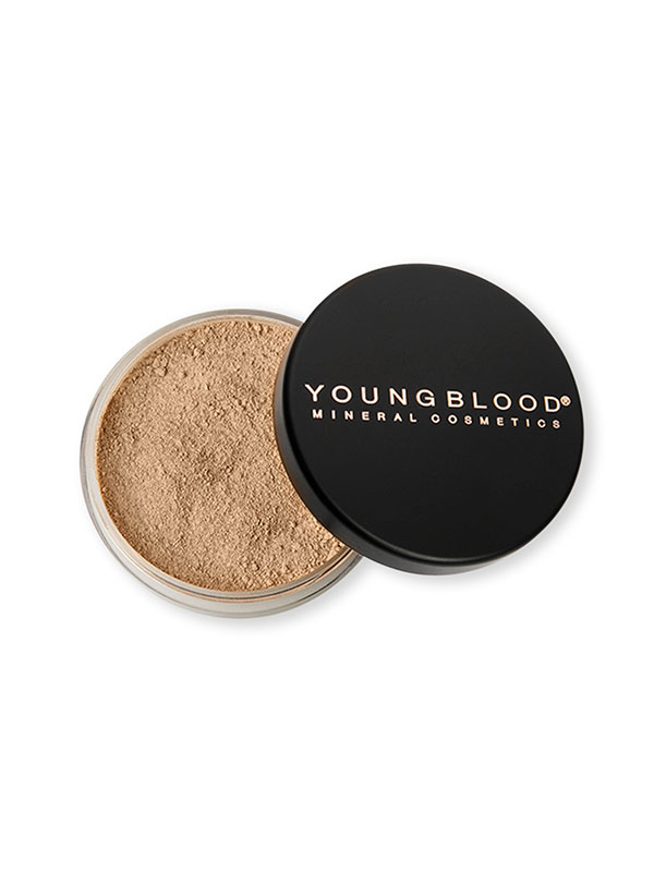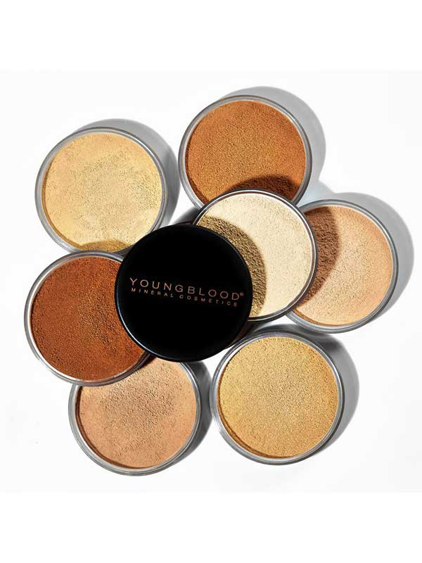 Kopauta puuteria hieman rasian kanteen ja levitä kasvoille pyörivin liikkein valitsemallasi Youngblood siveltimellä.