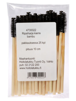 Ripsiharja kierre, varsi bambua, pituus 10 cm. Kertakäyttöistä maskaraharjaa voidaan käyttää ripsienpidennyksessä ripsien harjaamiseen tai meikeissä esim. laittaessasi asiakkaalle ripsiväriä, kulmakarvageeliä tai ripsivärin pohjustusainetta.