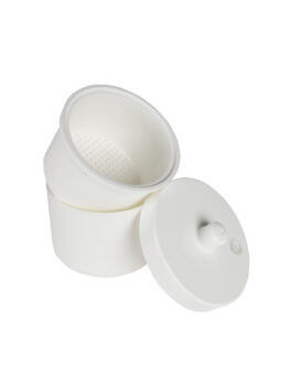 Desinfiointipurkissa on reiällinen sisäosa jonka avulla poranterät on helppo huuhtoa.
