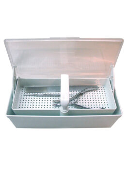 Kätevä kannellinen allas instrumenttien liotukseen. Kun nostat kannen, kori nousee automaattisesti nesteestä ylös.