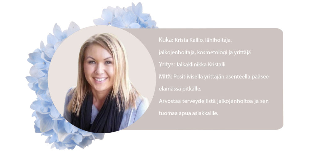 Olen haaveillut oman yrityksen perustamisesta ainakin 10 vuotta. Ajattelin, että kilpailu on kovaa ja että terveydellinen jalkojenhoito on se, millä voisi olla kysyntää. Vaikka nyt on ollut pandemia-aika, niin silti ajanvarauslistat ovat täyttyneet. Olen todella tyytyväinen, että perustin yrityksen vaikka se sattui hiukan haastavaan aikaan. Monet sanoivat, että nyt ei kannata korona-aikana lähteä yrittämään, mutta silti minulla oli itseluottavainen olo, että kyllä minä pärjään.