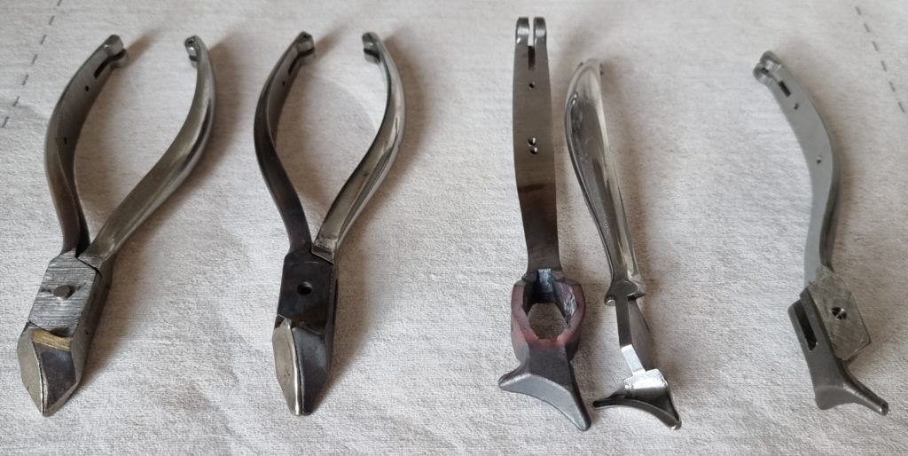 Ensimmäisenä oikealla on toisen puolen aihio. Toisena on kaksi aihiota vielä toisistaan erillään. Kolmantena on koottu leikkuri, joka on muuten kuitenkin vielä täysin viimeistelemätön. Vasemmassa reunassa on nivelen läpi lyöty kiinnitystappi, mutta terä on edelleen viimeistelemättä.
