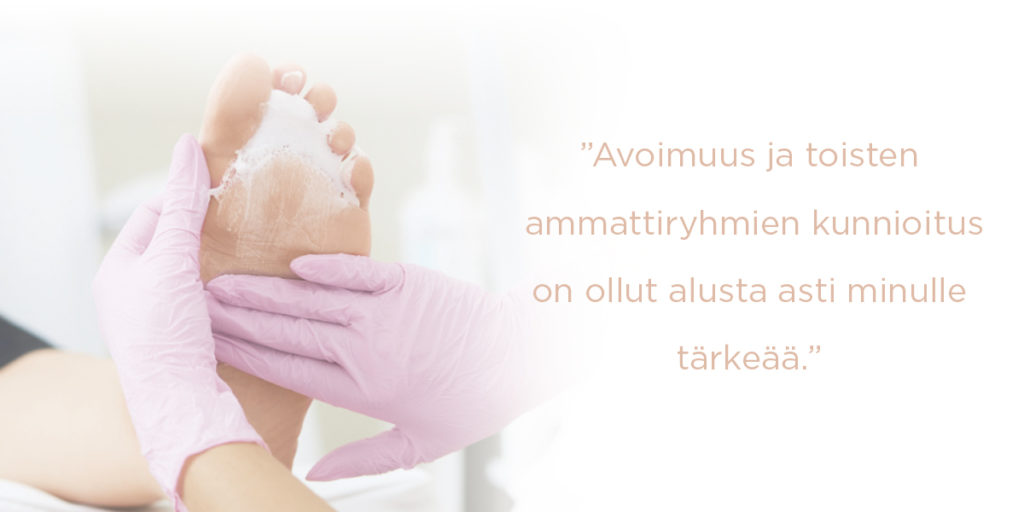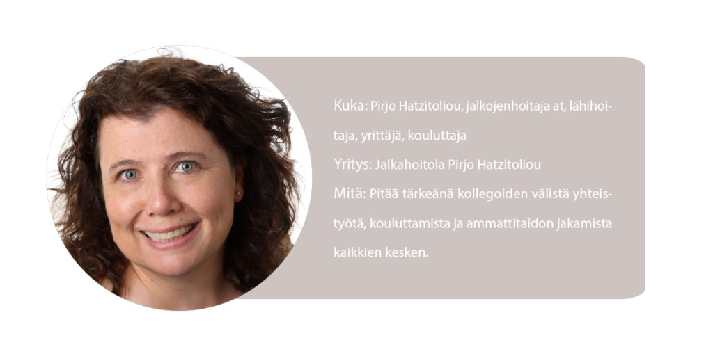 ”Arvostan yrittäjissä sitä, että oma oppiminen perustuu oppimishaluun ja laaja-alaiseen tietotaitoon, jota voidaan hakea monesta eri suunnasta rakennettaessa omaa liiketoimintaa. ” Tärkeimpänä asiana Pirjo pitää sitä, että samalla ammatillinen näkemys omaan työhön pysyy selkeänä. Siksi on tärkeää jakaa avoimesti kaikki tieto kollegoille sekä tukea ja neuvoa muita yrittäjiä vaikeiden jalkahoitoasiakkaiden kanssa.